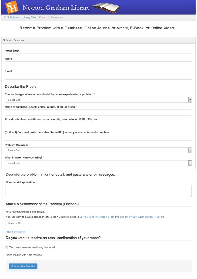 Problems are reported via the webform here: http://shsu.libanswers.com/eresources/