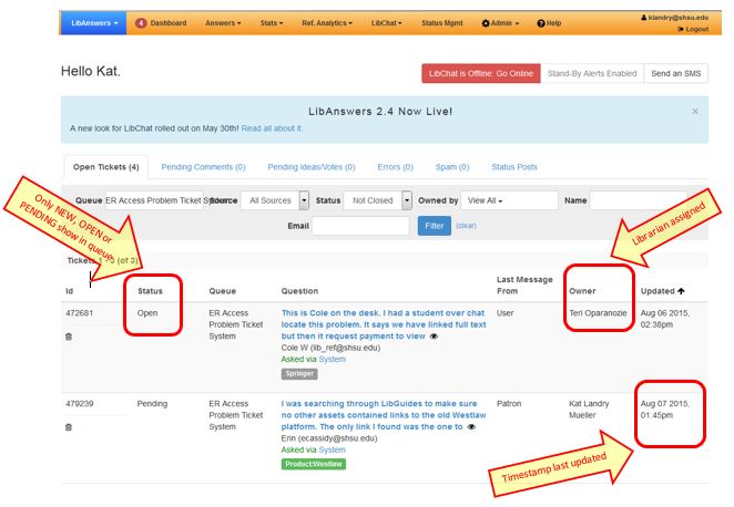 (Reference gets questions via chat/text that go into the main Reference queue… these won’t appear for us.)