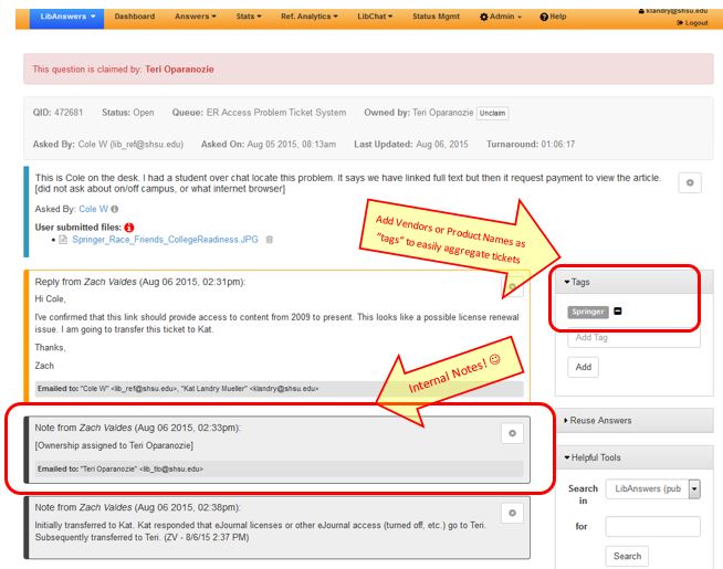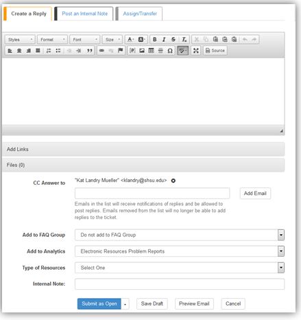 - If the problem is ongoing for an extended time period, you may consider to send a reply to the user (reported issue) as well as CC’ing an librarian who assisted them and also possibly Reference Librarian.